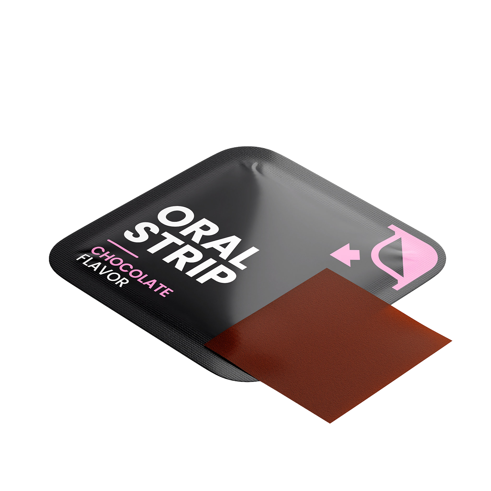 Place one chocolate-flavored strip on your tongue and allow it to dissolve completely.